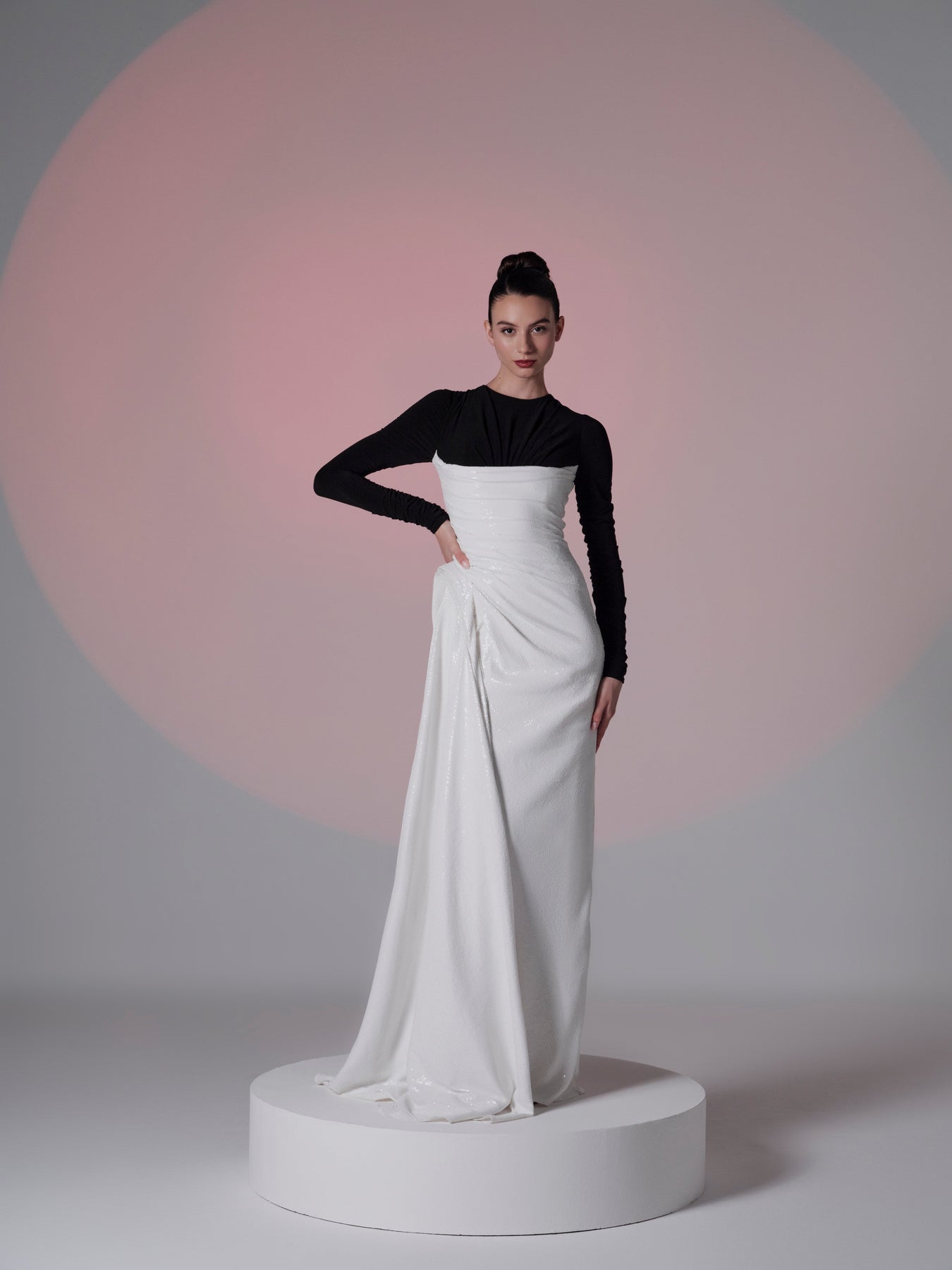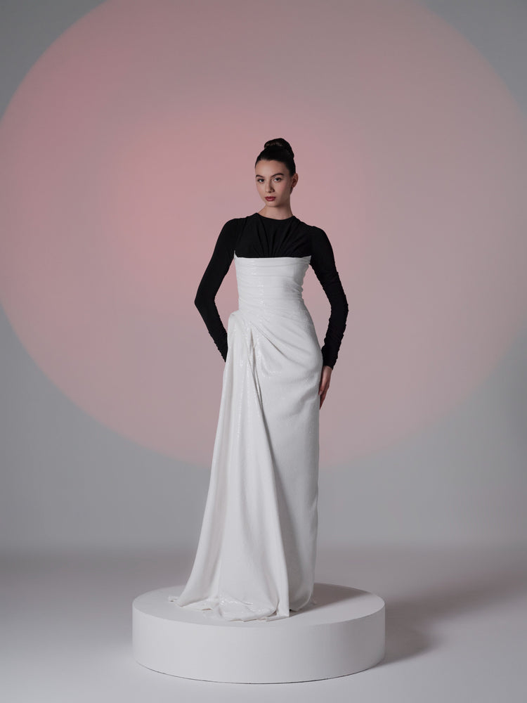 This striking black and white gown combines contrasting elements for a modern and chic look. The top features a fitted black long sleeve with a draped neckline, seamlessly transitioning into a white, sequined, and wrapped skirt that adds an elegant shine. The unique draping on the skirt creates a beautiful and structured silhouette, perfect for formal occasions that require a sophisticated yet bold statement.