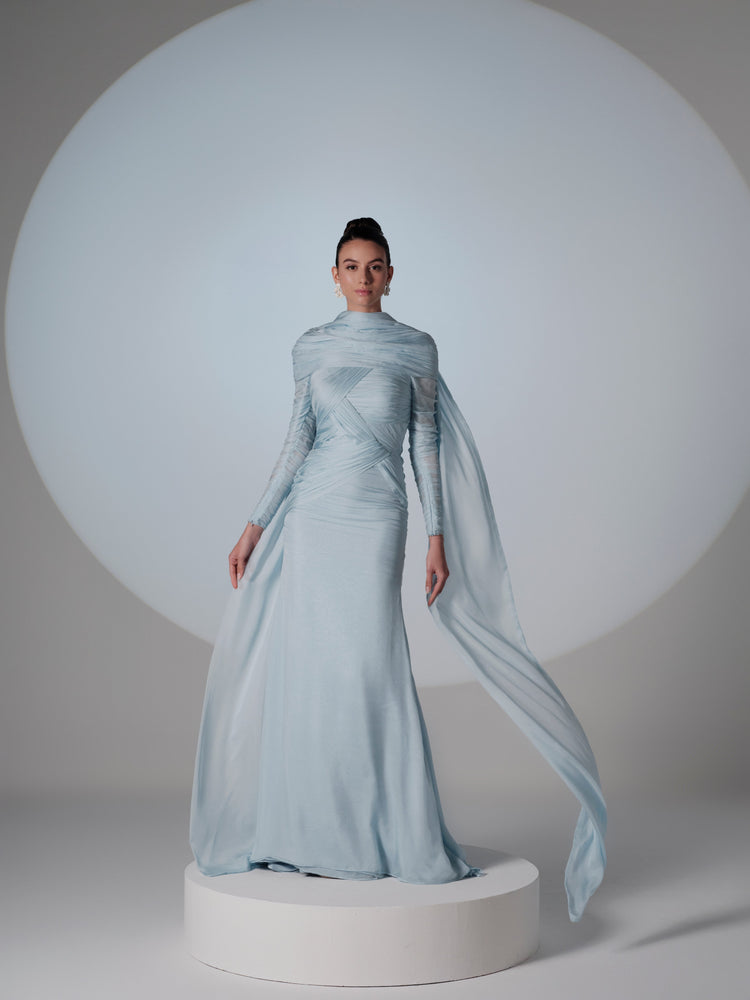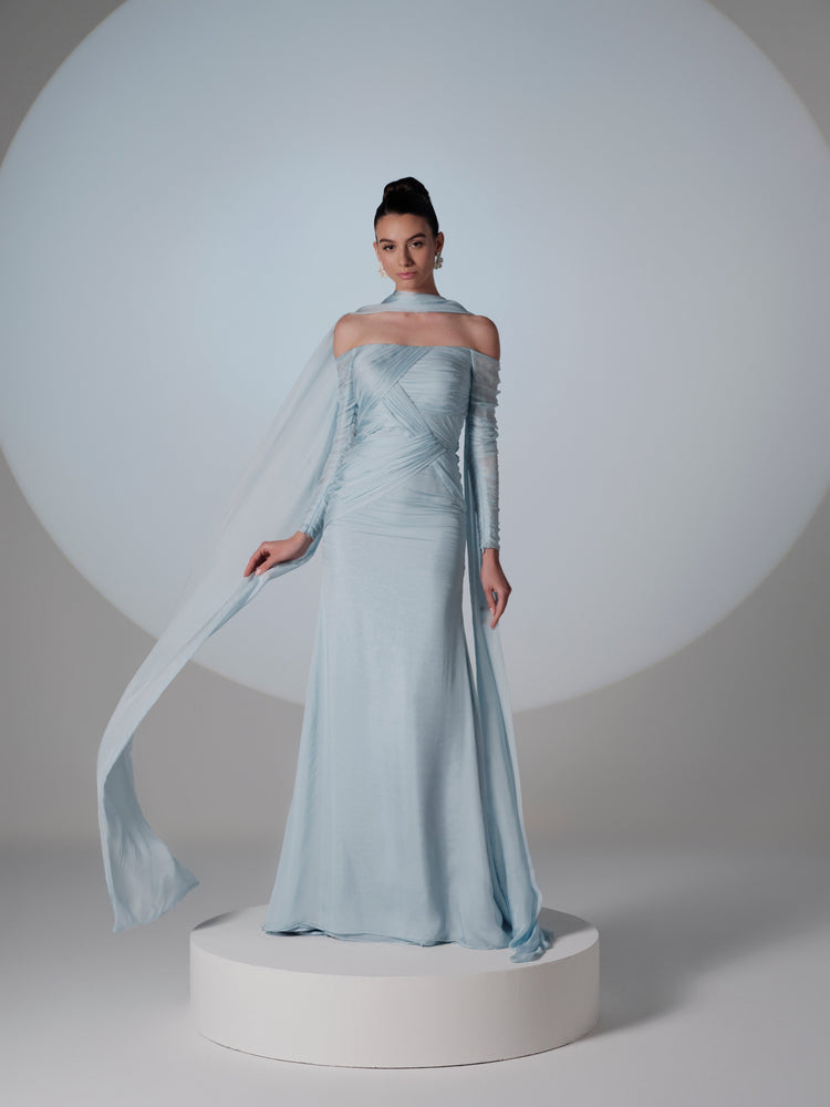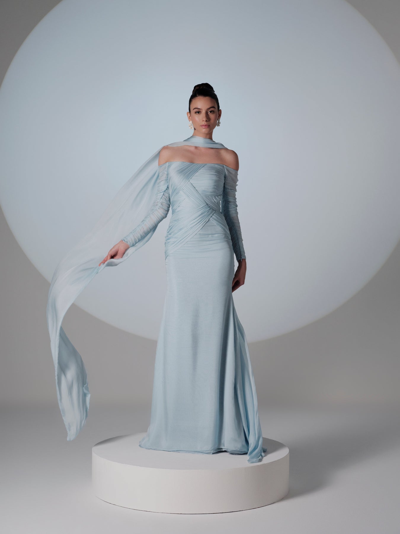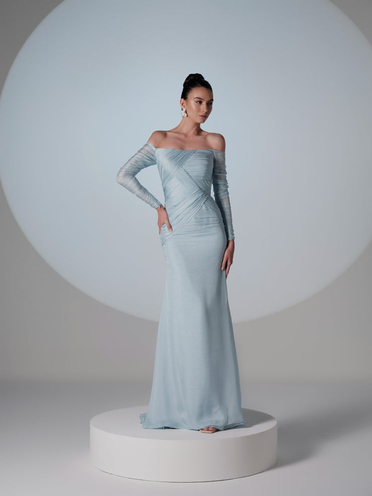 This chic off-shoulder gown in soft blue features a flattering, body-hugging design with elegant ruched detailing across the bodice. The delicate long sleeves add a sophisticated touch, while the smooth, flowing fabric creates a sleek silhouette. Perfect for evening events, this dress exudes modern elegance and refined beauty.