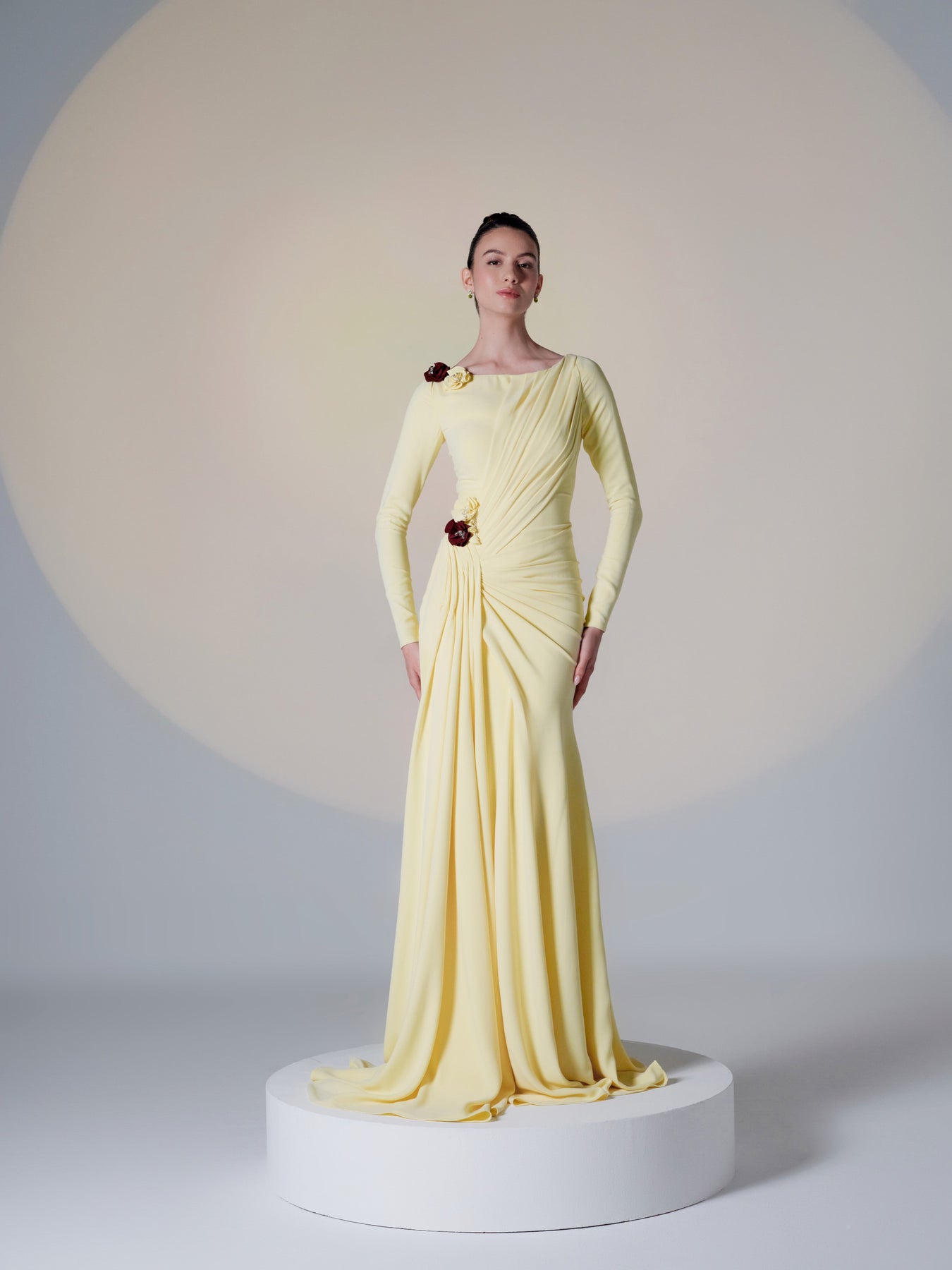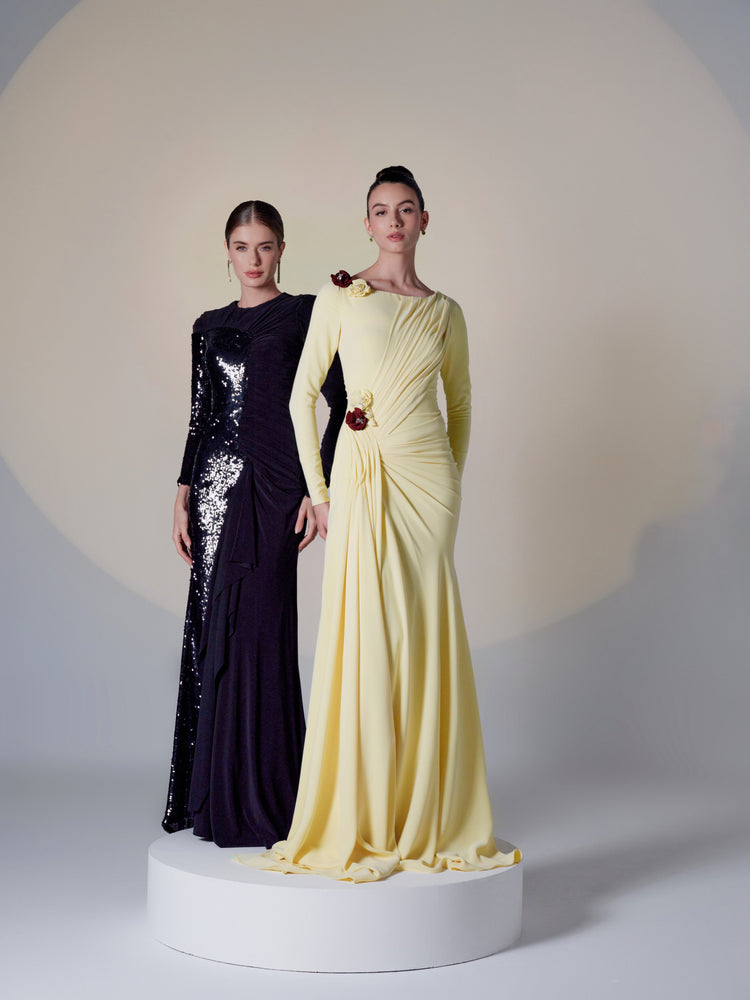 This stunning yellow gown features a draped design that flows gracefully across the body, creating a sophisticated and flattering silhouette. The twist detail at the waist adds structure and elegance, while the long sleeves and flowing fabric enhance the gown’s timeless beauty. Perfect for formal occasions, this dress exudes both luxury and refinement.