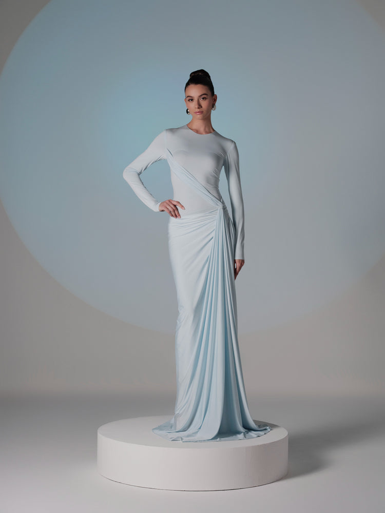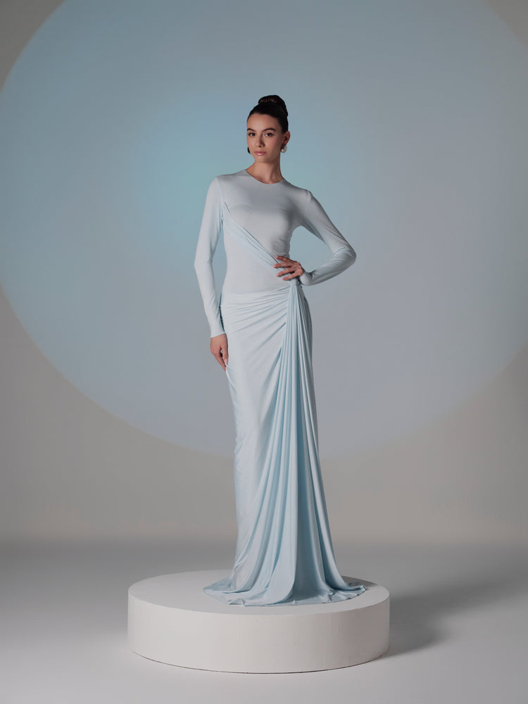 This ethereal light blue gown features a beautifully draped design that accentuates the body with its figure-flattering silhouette. The sleek long sleeves and twisted fabric detail on the waist add an elegant touch, while the flowing skirt creates a soft and graceful movement. Made from luxurious satin fabric, this dress exudes timeless elegance, making it ideal for any formal occasion where sophistication is key.
