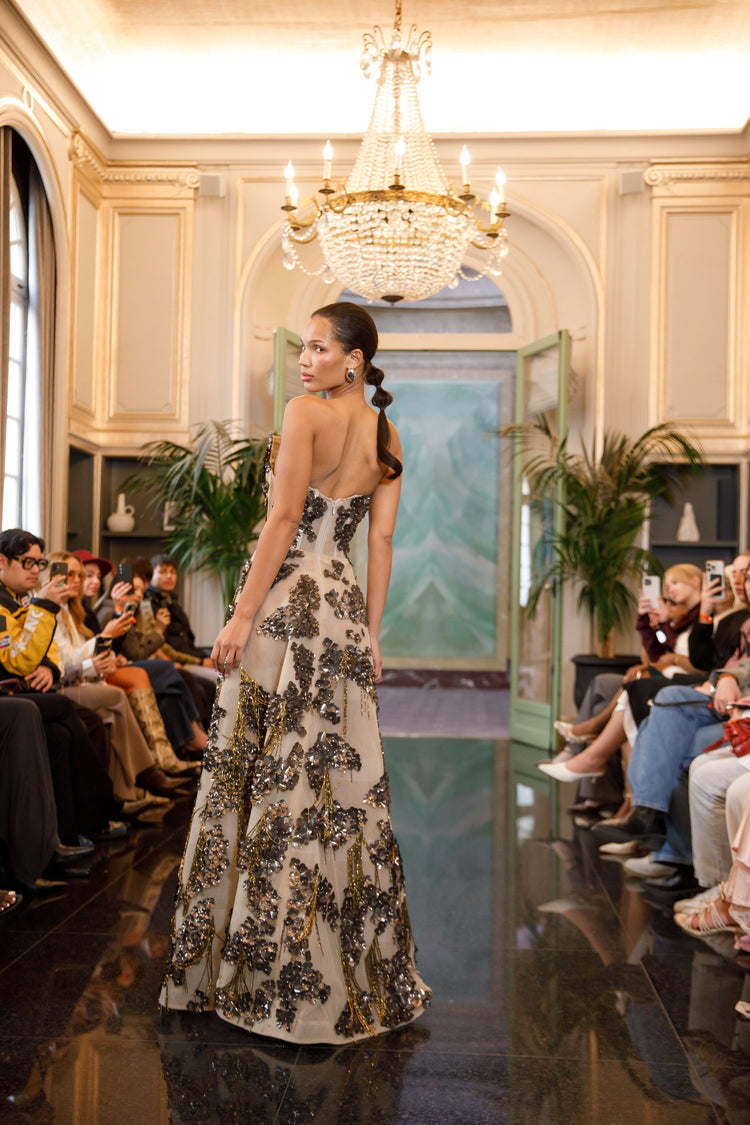 This breathtaking gown in off white and black is a true couture masterpiece, crafted from sheer tulle adorned with handmade beaded floral embroidery and intricate metallic gold threads. The design features a long golden chain fringe, adding movement and radiance with every step. This piece perfectly blends sophistication with craftsmanship—ideal for grand soirées and red-carpet appearances.