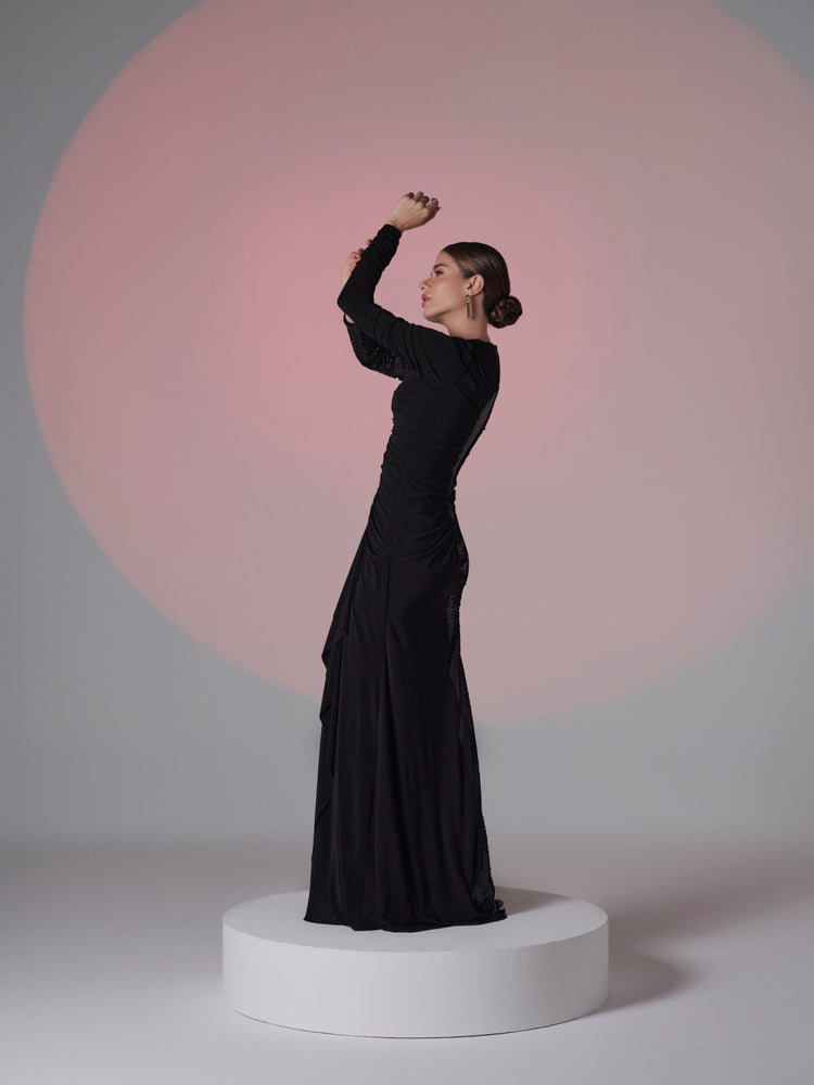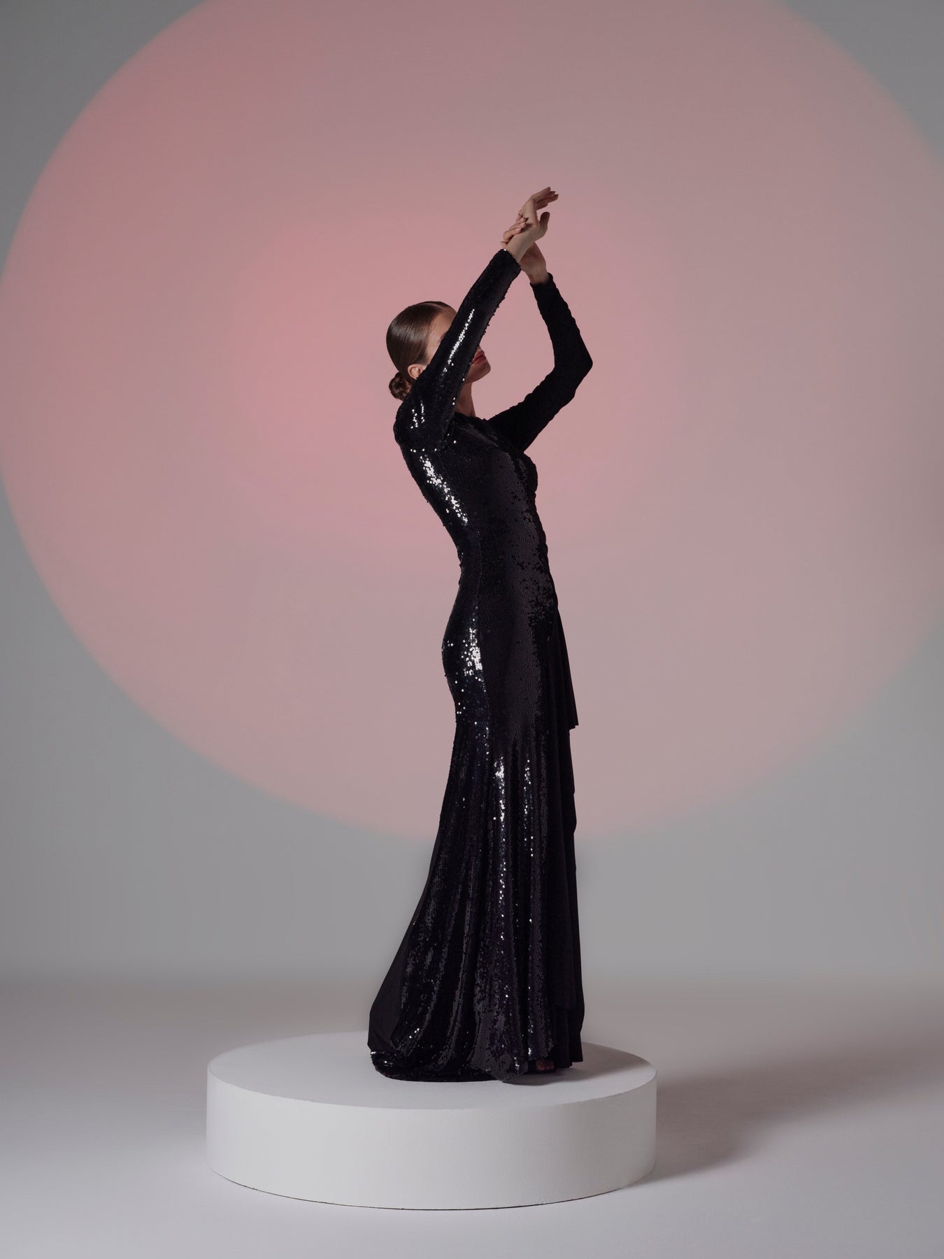 This glamorous black gown combines the shine of sequins with the flowing elegance of fabric. The fitted, sequined bodice with long sleeves adds a bold, sparkling touch, while the draped fabric at the waist and hip creates a flattering silhouette. The contrast between the sequin detailing and the soft flowing skirt brings sophistication and movement, making it perfect for formal events where luxury and style are essential.