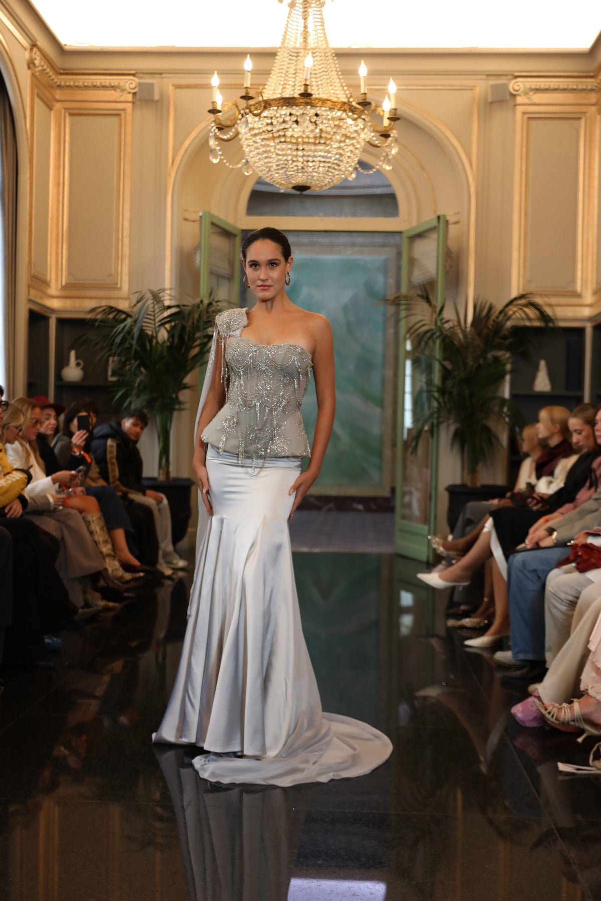 This mesmerizing gown in silver blends timeless elegance with modern glamour. Crafted from premium satin and pure silk chiffon, it features intricate beaded silver rhinestones that shimmer with every movement. The sculpted bodice flatters the figure, while the flowing satin skirt cascades effortlessly to the floor, creating a regal silhouette. Perfect for red-carpet evenings, galas, or elegant receptions, this gown defines true luxury.