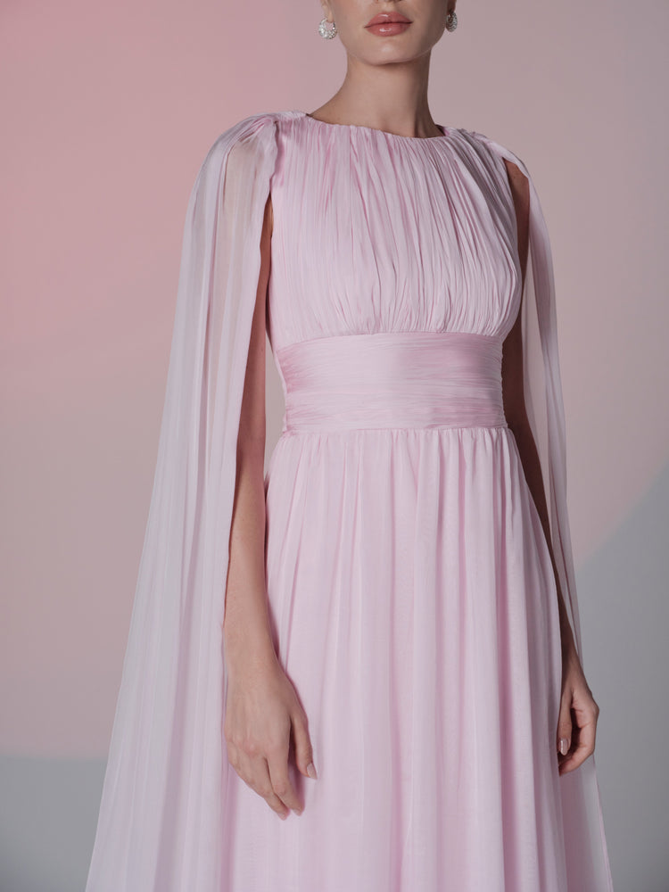 This stunning blush pink gown features a graceful silhouette with delicate pleats along the bodice and a flowing, soft skirt. The highlight of this dress is the ethereal cape that drapes from the shoulders, adding a regal touch to the overall design. Crafted from lightweight satin fabric, this dress offers both comfort and elegance, making it perfect for formal events where a timeless and sophisticated look is desired.
