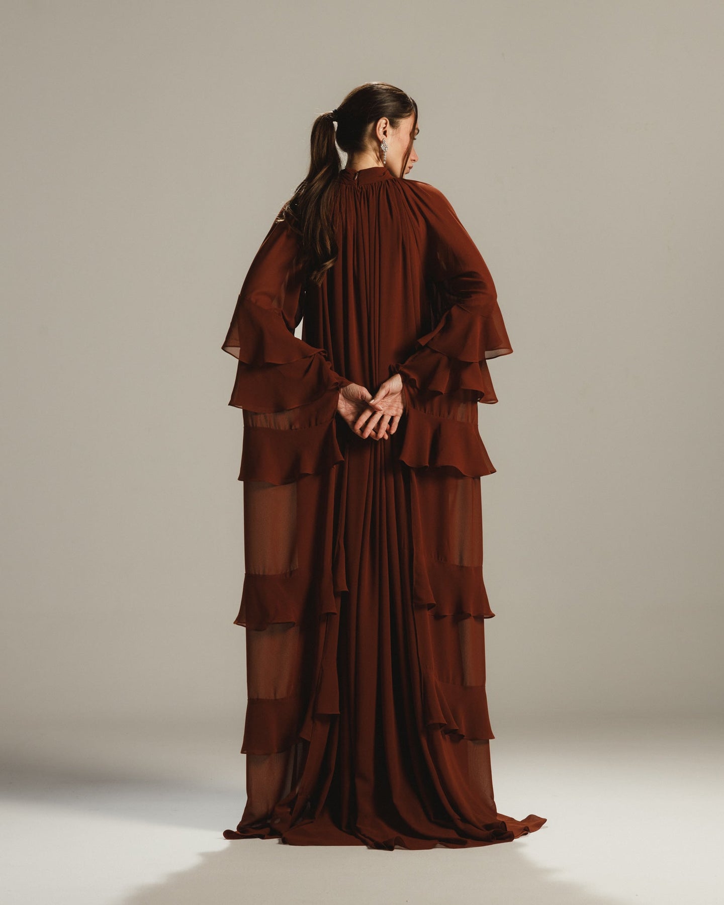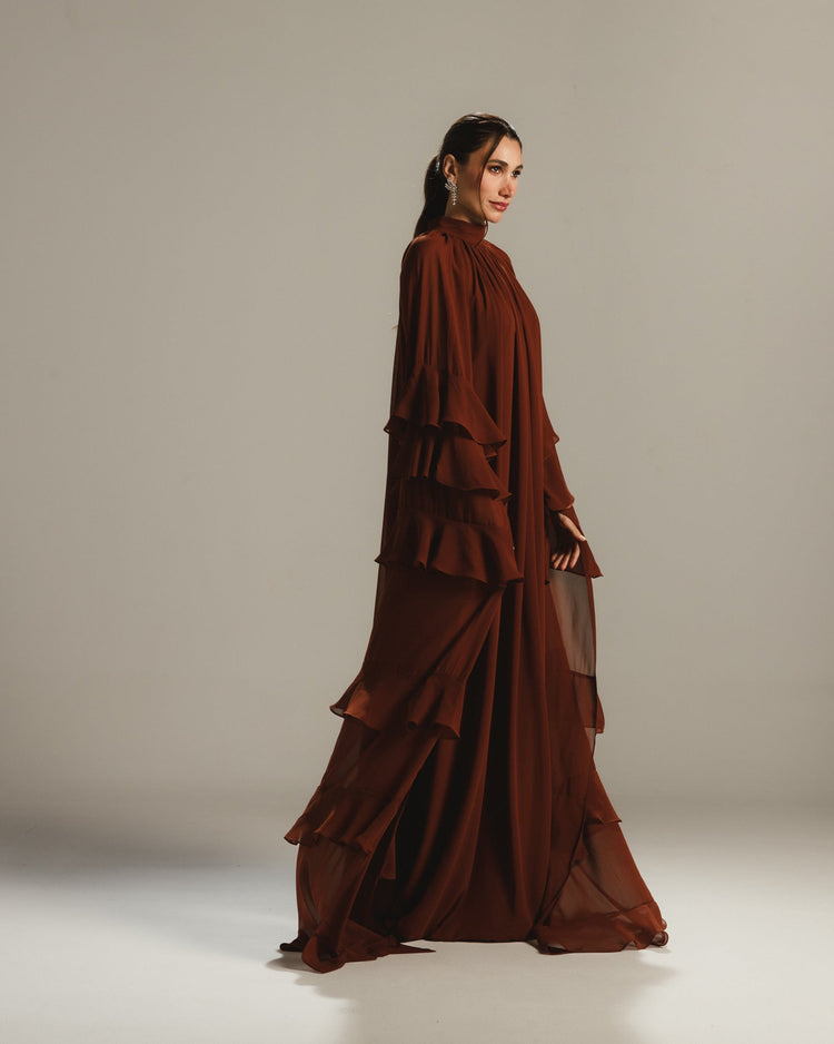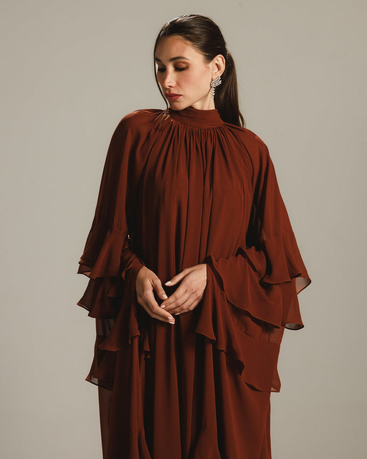 Make a timeless statement in this deep chestnut chiffon gown, designed for flowing elegance and artistic flair. The high gathered neckline creates a soft, draped silhouette, while the tiered ruffle sleeves add a dramatic, fashion-forward touch. With its voluminous body and fluid movement, this gown blends modesty and sophistication effortlessly.