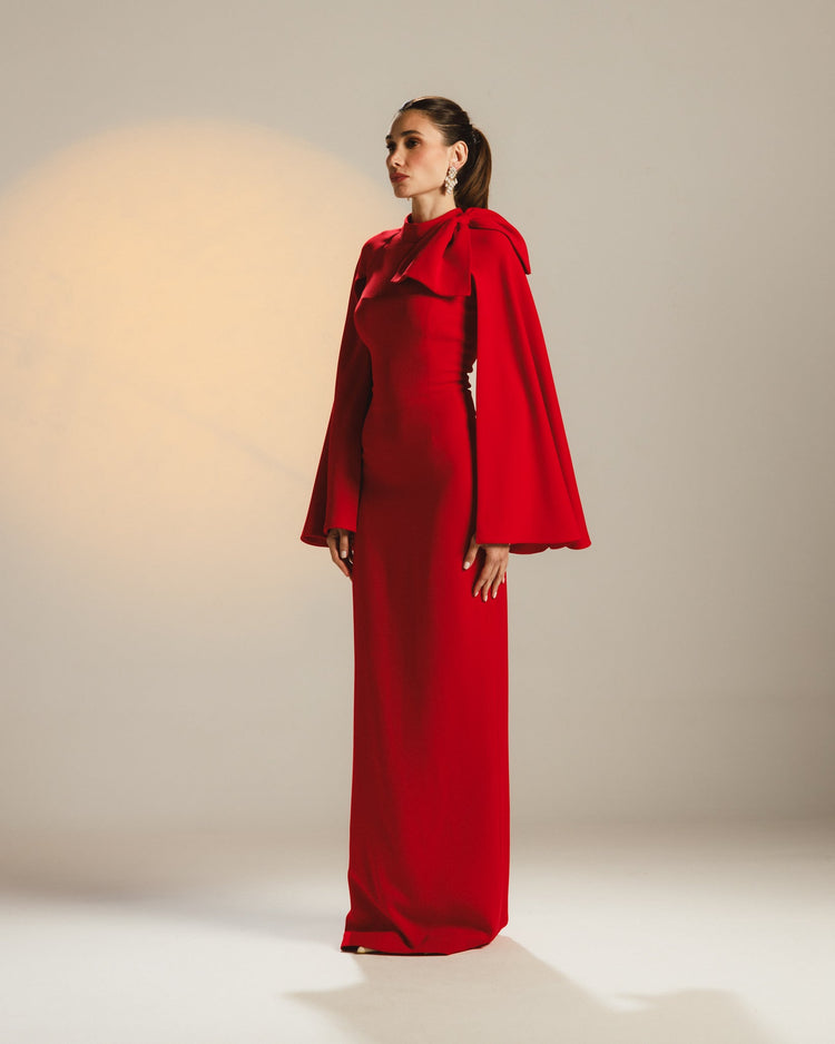 Command attention in this striking red gown, defined by its clean lines and bold details. The standout feature — an oversized asymmetric bow at the shoulder — brings a sculptural elegance to the minimalist bodice. Designed with a fitted silhouette and high neckline, this piece is the embodiment of powerful femininity, blending drama with polish.